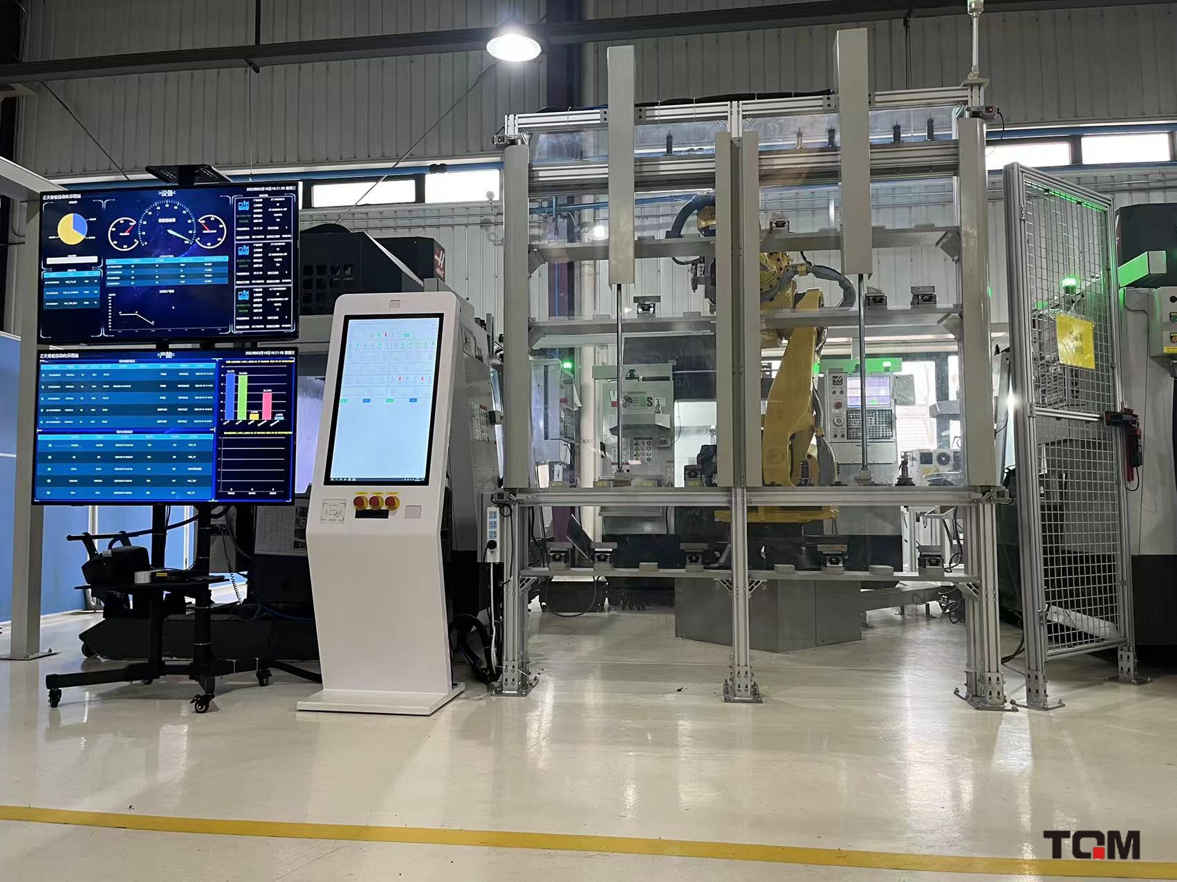 智能柔性生产单元,利用三台机床及机械臂设计研发为岛式生产单元,自动调度智能生产单元内进行生产行,机床稼动率达到96%以上。